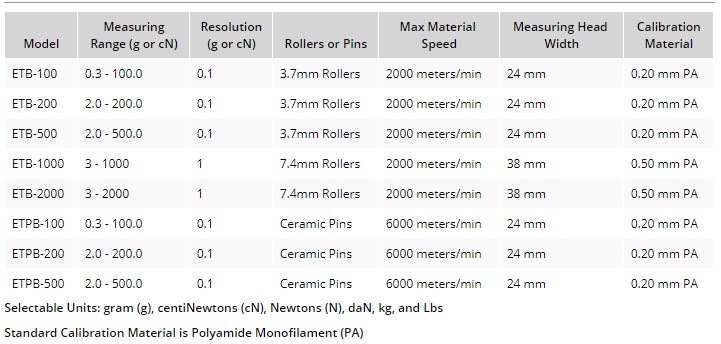 Checkline ETX / ETPX數(shù)據(jù)記錄張力儀專為在各種應用中精確測量細金屬絲,紗線和纖維上的張力而設計。滾子或陶瓷銷釘安裝在長的“指狀物”的末端,使用戶可以在有限的進入空間內(nèi)或在幾條線緊緊排列時(例如在經(jīng)紗板上)測量張力。提供五(5)個測量范圍,最大容量為2000克或cN。1000 g和2000 g型號分別在短銷(手指)上安裝了直徑7.4mm的V型槽滾輪,而不是標準長度的銷(手指)和3.7 mm微型滾輪。