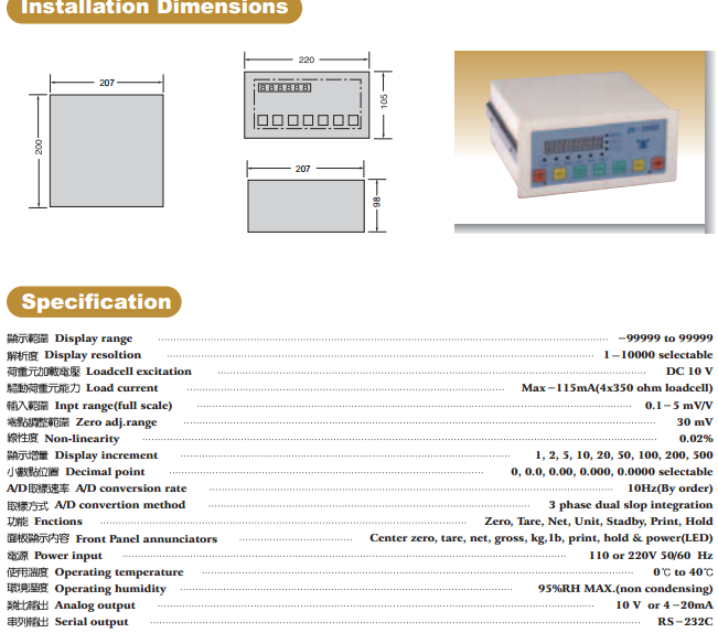 臺(tái)灣JIHSENSE JS-320_JS-320稱重顯示控制器可標(biāo)配本品牌所有模擬荷重元規(guī)格: