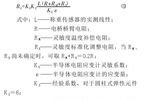 由于彈性元件機械加工、熱處理和粘貼電阻應變計等因素影響,稱重傳感器的固有非線性誤差分散較大,不能通過 3 只 ~5 只稱重傳感器進行線性補償試驗,求得線性補償電阻 RL的平均值用于批量生產(chǎn)的線性補償中,必須逐個稱重傳感器進行線性補償。一般線性補償方法為通過經(jīng)驗公式計算出線性補償電阻值,將其增大 10%~15%就是線性補償半導體應變計的過補償電阻值。進行線性補償時,只需在線性過補償電阻上并聯(lián)一個金屬膜線性補償精調(diào)電阻,即可精確調(diào)整稱重傳感器的線性補償特性,達到線性補償?shù)哪康?。補償特性與許多因素有關,半導體電阻應變計線性補償電阻 RL計算公式如下: