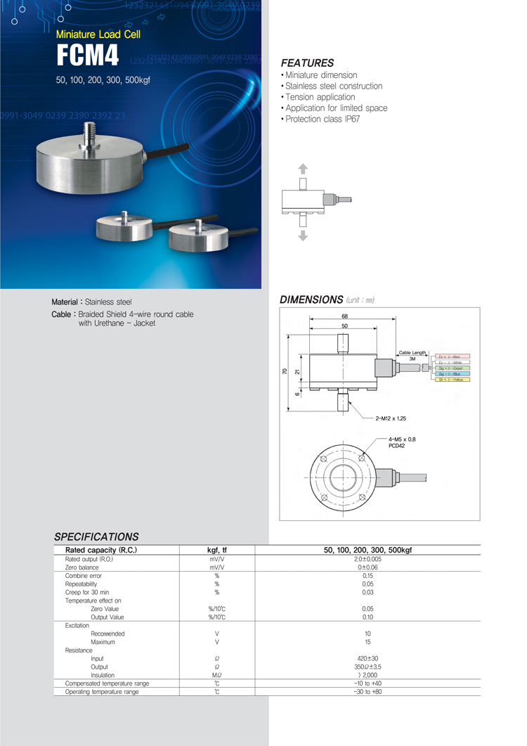 韓國Bongshin FCM4-500KG稱重傳感器全焊接不銹鋼密封設(shè)計,適用于惡劣環(huán)境中,同時也是專為壓式低平臺而設(shè)計,小巧的尺寸使FCM4稱重傳感器有非常廣泛的應(yīng)用,包括測試和稱重系統(tǒng)。zBv廣州南創(chuàng)電子科技有限公司