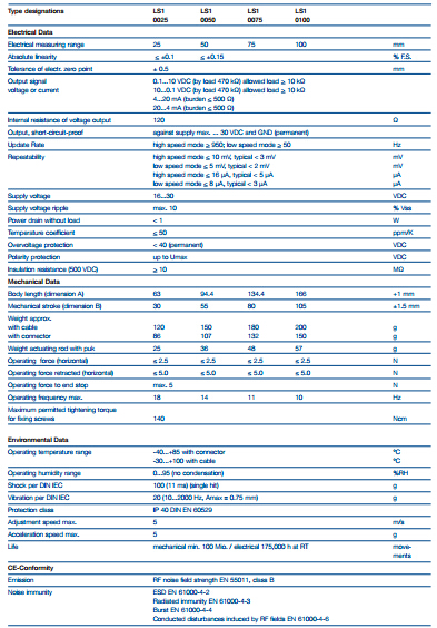 LS1系列位移傳感器模擬量接口抗磁干擾標(biāo)準電壓電流信號輸出帶彈簧復(fù)位兩邊支撐拉桿 絕對值輸出線性優(yōu)異達正負0.075%分辨率12 或者13 bit輸出電纜或插頭可選防護等級IP67/ 68 型號列舉:LS1-25 、LS1-50 、LS1-75 、LS1 -100 XUn廣州南創(chuàng)電子科技有限公司