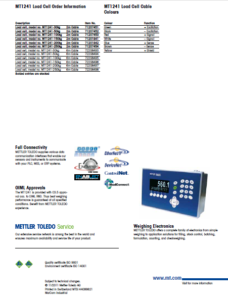 瑞士梅特勒托利多MT1241-30kg稱重傳感器具體型號量程: IXL廣州南創(chuàng)電子科技有限公司
