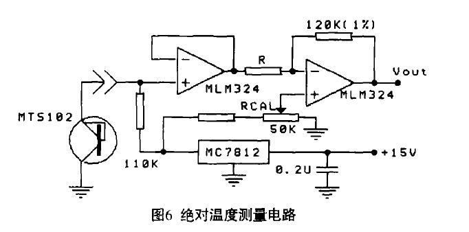 絕對(duì)溫度的實(shí)際測(cè)量電路如圖6所示.圖中溫度傳感器的輸出接到同相單位增益緩沖放大器(它由1 /4的MLM324運(yùn)放組成)。由于該放大器具有輸人阻抗高輸出阻抗低的特氛所以可減小放大器對(duì)傳感器所取的信號(hào)電流。