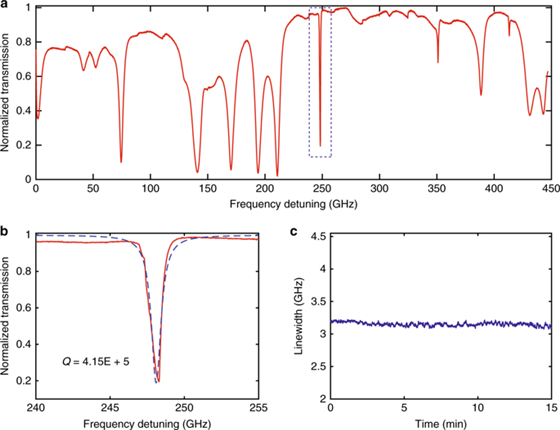 我們首先使用應(yīng)用程序顯現(xiàn)了封裝的WGM傳感器的光譜特性,傳輸頻譜如圖2a所示,頻率跨度為450 GHz,從而可以觀察到具有不同共振頻率、品質(zhì)因數(shù)和極化的多個共振模式。具有更高品質(zhì)因數(shù)的諧振模式將有助于解決更小的頻率漂移,從而提高傳感性能。圖2b給出了高質(zhì)量模式和洛倫茲擬合的透射光譜,品質(zhì)因數(shù)為~4.2×1。為了驗(yàn)證整個系統(tǒng)的穩(wěn)定性,記錄共振模式線寬的時間軌跡為15分鐘,觀察到3.15GHz的平均線寬,標(biāo)準(zhǔn)偏差為0.03GHz(圖2c)。vNF廣州南創(chuàng)電子科技有限公司