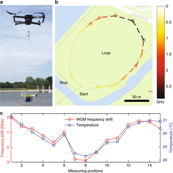 當(dāng)無人機(jī)從一個測量位置飛到另一個測量位置時,WGM傳感器的共振頻率由于溫度變化而發(fā)生變化,共振頻率的變化如圖4b所示 ,其中可以清楚地看到溫度變化的梯度,測量結(jié)果與商用溫度計(jì)的結(jié)果匹配良好(圖 4c)。在補(bǔ)充材料中我們提供了視頻演示,其中攜帶整個系統(tǒng)的無人機(jī)從具有較高溫度(在陽光下)的一個位置飛行到具有較低溫度(在陰影中)的另一個位置,使用定制的移動應(yīng)用程序可以清楚地觀察到共振頻率的偏移。vNF廣州南創(chuàng)電子科技有限公司