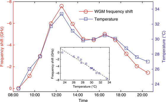 通過12小時的測量,我們獲得了所選諧振模式的頻移圖(如圖3所示) ,封裝WGM傳感器的共振頻率偏移與商用溫度計(jì)的結(jié)果匹配良好,并且與溫度變化具有線性關(guān)系(圖 3插圖)。兩條曲線的小偏差主要來自激光頻率的不穩(wěn)定性,通過優(yōu)化激光電流驅(qū)動器和TEC控制器的電路設(shè)計(jì)可以將偏差最小化。vNF廣州南創(chuàng)電子科技有限公司