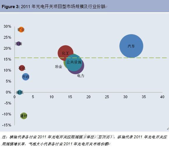 2011年,項目市場光電開關(guān)銷售額為1.46億元,同比增長15.8%,低于2010年16.7%的市場增速。該市場銷量最大的行業(yè)是汽車,銷售業(yè)績?yōu)?160萬元,占項目型市場的21.7%。電力行業(yè)作為第二大應(yīng)用行業(yè),2011年對光電開關(guān)的需求由2010年的下滑3.4%轉(zhuǎn)為同比增長12%,業(yè)績達(dá)到1650萬元。ND0廣州南創(chuàng)電子科技有限公司