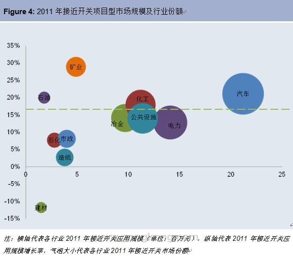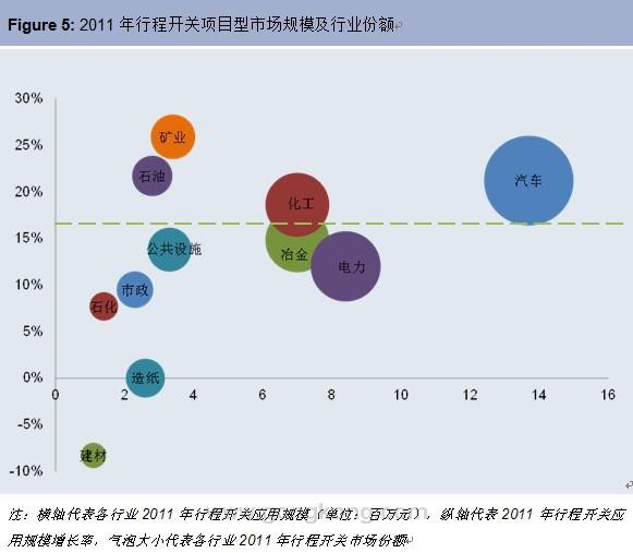 除建材行業(yè)接近開關(guān)、光電開關(guān)和行程開關(guān)的市場需求分別同比下滑11%、12%和8%之外,項目型市場其他行業(yè)領(lǐng)域的傳感器應(yīng)用均有不同程度的增長,其中、汽車、礦業(yè)和石油行業(yè)的增長超過20%。