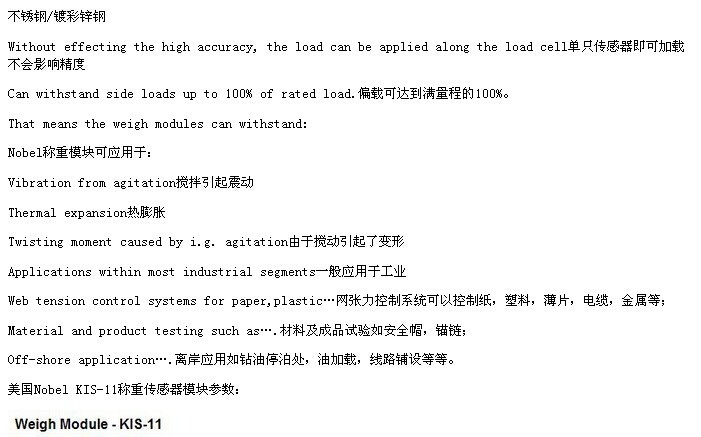 根據(jù)稱重模塊的受力特性的實(shí)際應(yīng)用,稱重模塊分為兩種類型;靜態(tài)模型和動(dòng)態(tài)稱重的稱量模塊。美國Vishay Nobel稱重模塊KIS-11靜態(tài)稱重只有垂直力應(yīng)用模塊,為反應(yīng)器,水箱,重量檢測儲(chǔ)料斗。動(dòng)態(tài)加載模塊,將力明顯的場合。如平臺(tái),重量檢測,輸送帶生產(chǎn)線。ZTT廣州南創(chuàng)電子科技有限公司